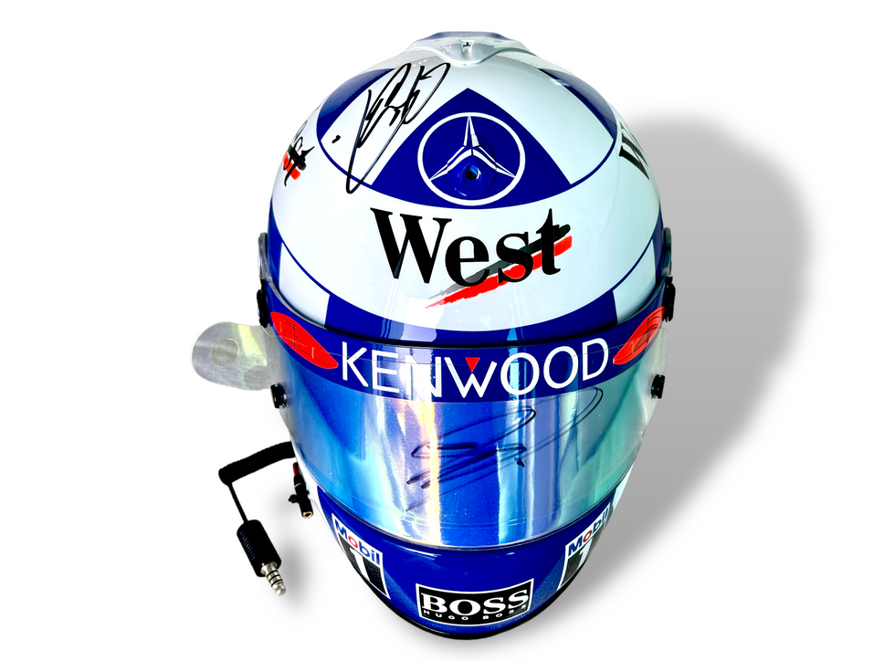 Twice hand-signed by Coulthard, above the crown on top of the shell and once again on the tear-off, both in black marker.
