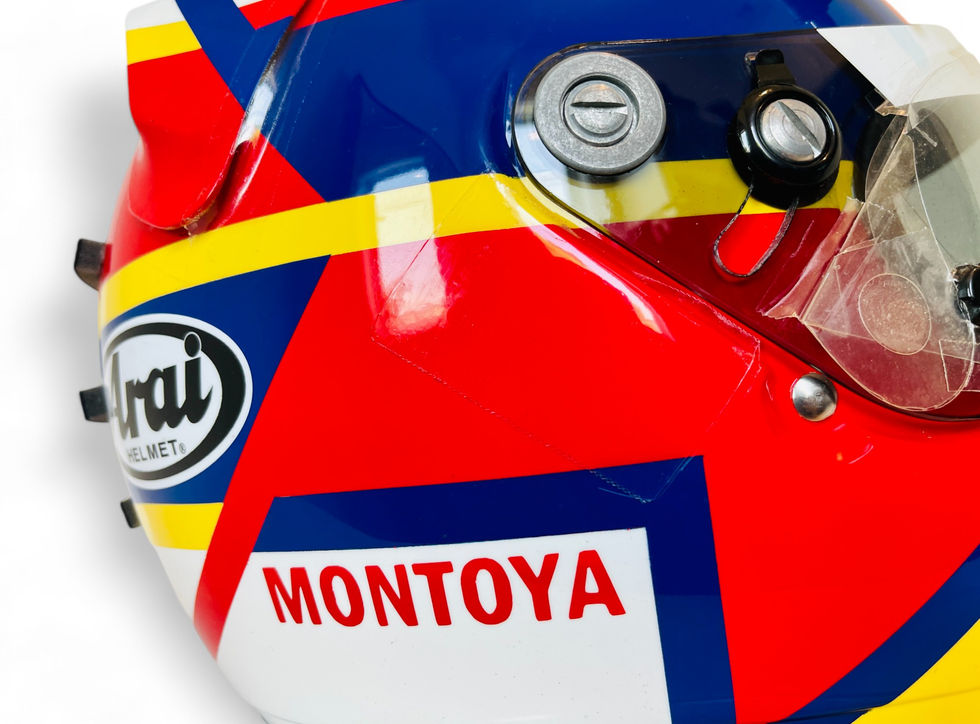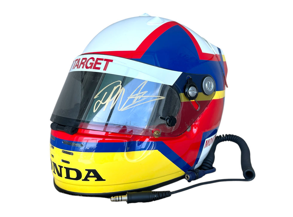 This helmet was hand-signed by Montoya on the tear-off in gold marker.